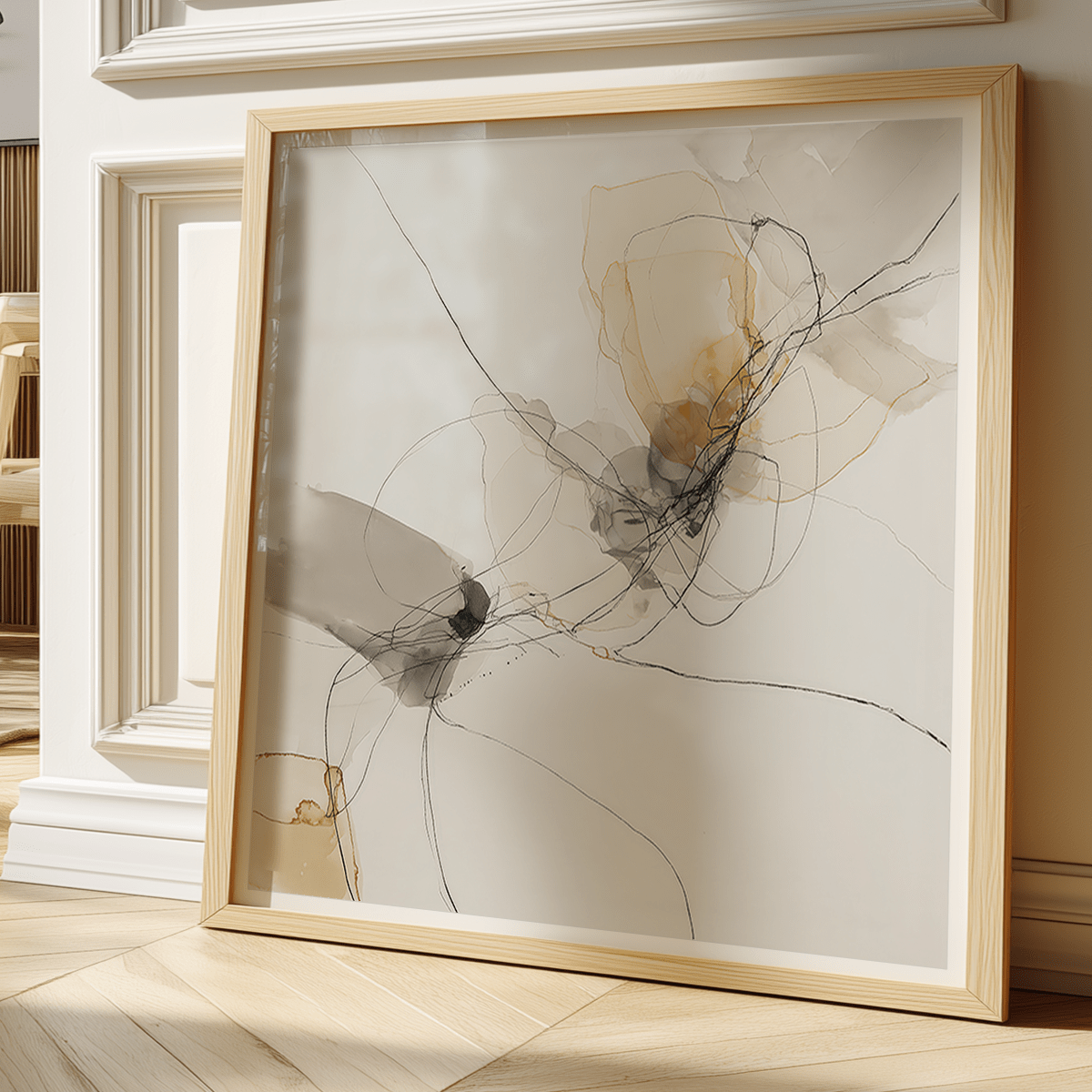 A refined modern abstract wall art print with grey, black, and warm gold tones — perfect for minimalist and contemporary interiors.