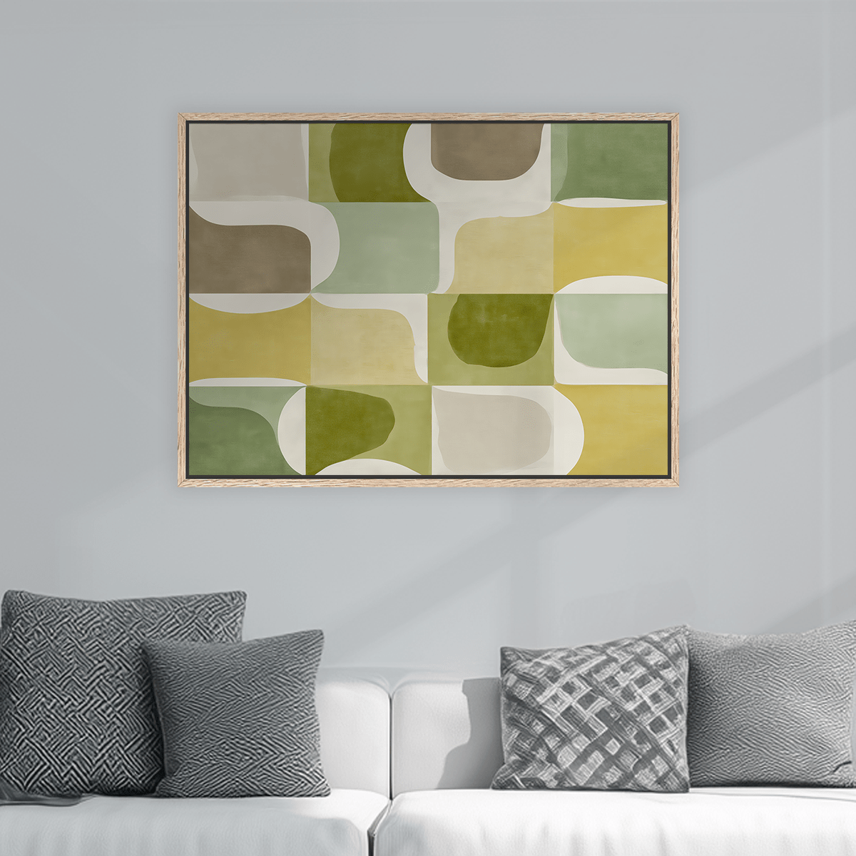 Elevate your space with the Tualipa Green Abstract Canvas Wall Art, a modern piece inspired by mid-century design. Featuring a grid of organic shapes in soft sage, olive, beige, and muted yellow tones, it brings warmth and balance to any room. Finished in a light wood frame, this artwork adds calm sophistication to modern, boho, or Scandinavian interiors.