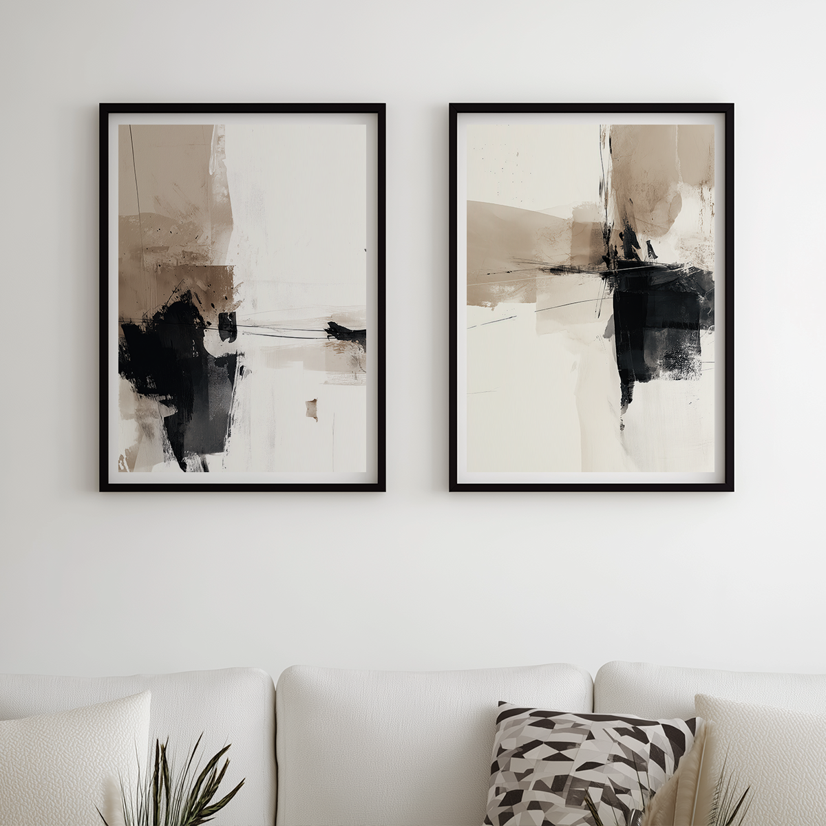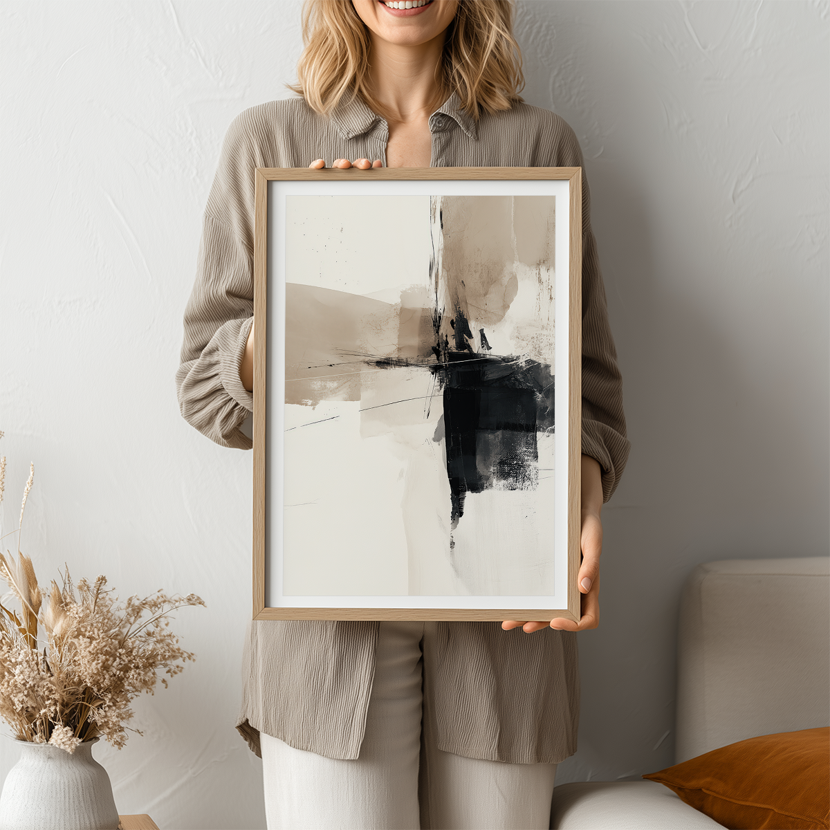 Bring the feeling of a modern art gallery into your home with this striking neutral abstract painting. Bold black brushstrokes flow across a backdrop of soft beige and white, creating a balanced and sophisticated look. The textured details and layered design make this piece perfect for adding depth and interest to any space. Ideal for living rooms, bedrooms, or office walls, this contemporary abstract wall art blends seamlessly with minimalist, Scandinavian, or Japandi interiors. A true conversation starter, it invites you to pause, reflect, and enjoy its calming energy every time you see it.
